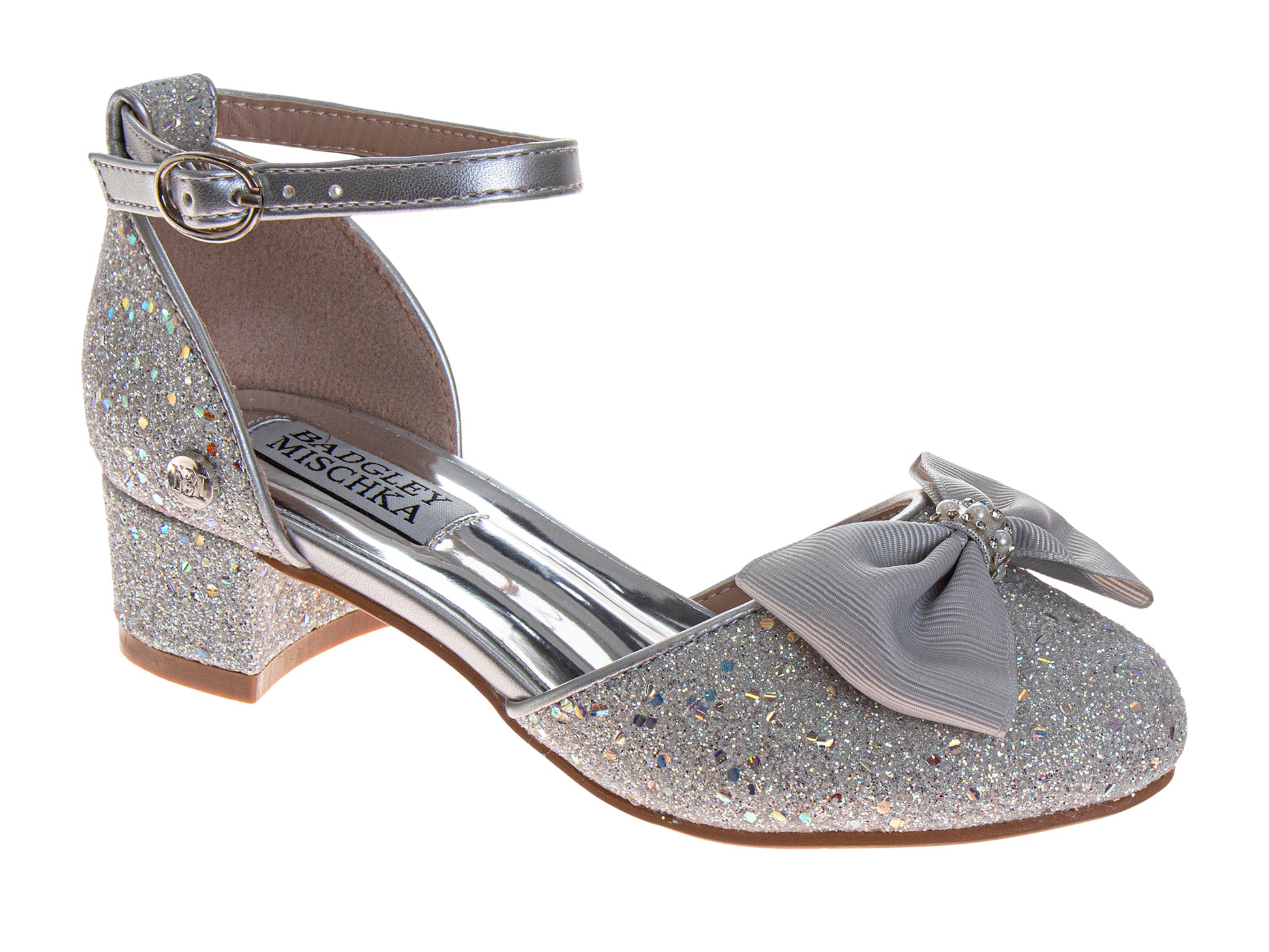 Badgley Mischka girls glitter dress heels, featuring a beautiful bow accent and a secure ankle strap. The low block heel and cushioned insole provide comfort and stability, making them perfect for parties, weddings, holidays, and formal events. Available in Little Kid–Big Kid sizes.