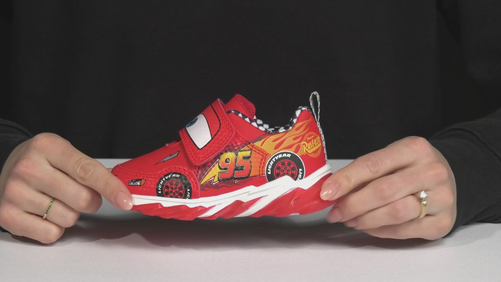 - Your little racer will love these cars lightning Mcqueen themed sneakers! They are perfect for zooming around the playground or the living room. These sneakers have a cool design that features Mcqueen's face and number on the sides, and they light up with every step. Plus, they have a hook and loop closure that makes them easy to put on and take off, and a rubber sole that provides traction and durability. These sneakers are comfortable, fun, and stylish. Your kid will feel like a champion in these cars lightning Mcqueen themed sneakers!